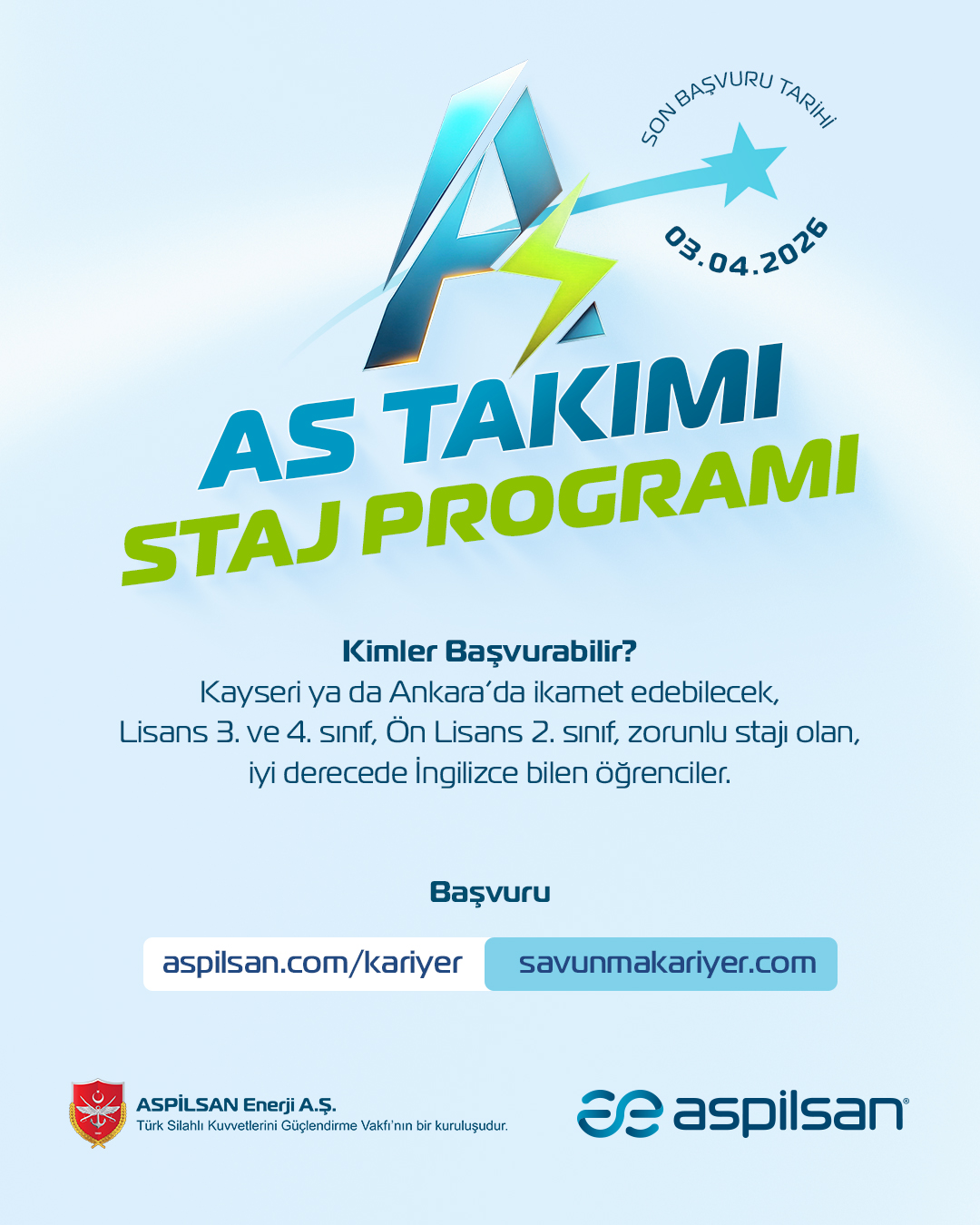 ASPİLSAN Enerji’nin dinamik dünyasında yer almak ve geleceğin teknolojilerine katkı sunmak isteyen genç yetenekleri AS Takımı Staj Programına bekliyoruz.